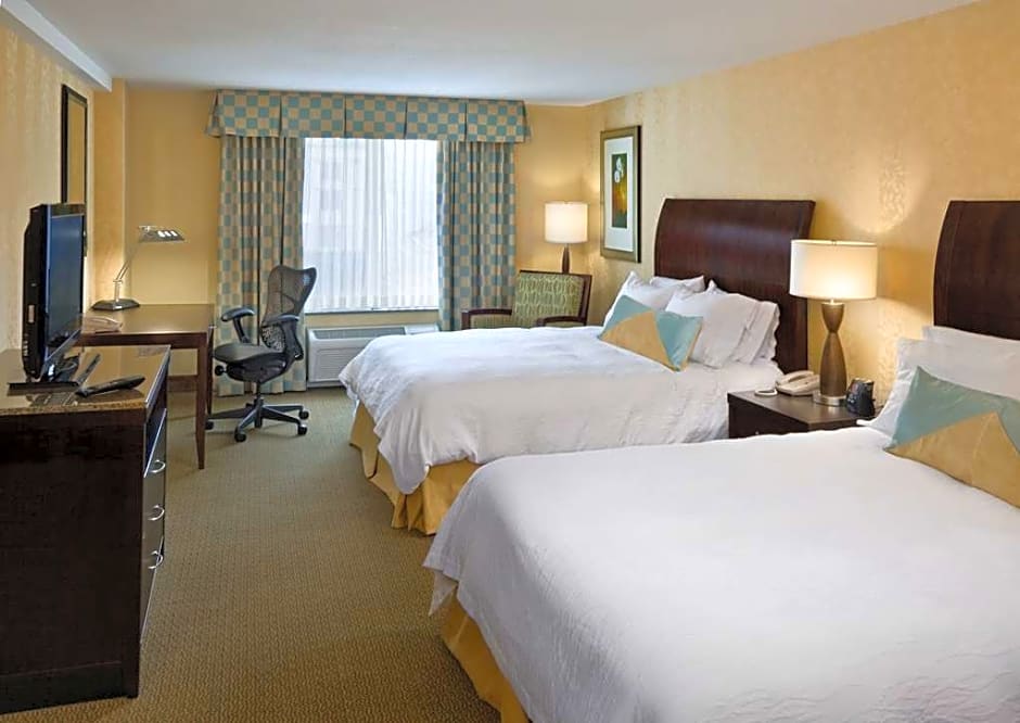 This mobility and hearing accessible standard room features two queen-sized beds, and a roll-in shower. The room also has a visual alarm, and notification devices for the doorbell or door knock and incoming telephone calls. Roll-in shower with attached accessible seating, lowered vanity in bathroom, and lowered closet shelf. The ergonomic Mirra chair by Herman Miller is good for your back and better for work. Enjoy your favorite television show on our 36-inch HDTV. There's also a microwave, refrigerator and coffee/tea maker to help you feel at home. And for conducting business, our rooms ensure your productivity thanks to the spacious work desk, two telephones with dataport and voicemail. Any corresponding photo may not reflect the specific accessible room type or room feature.